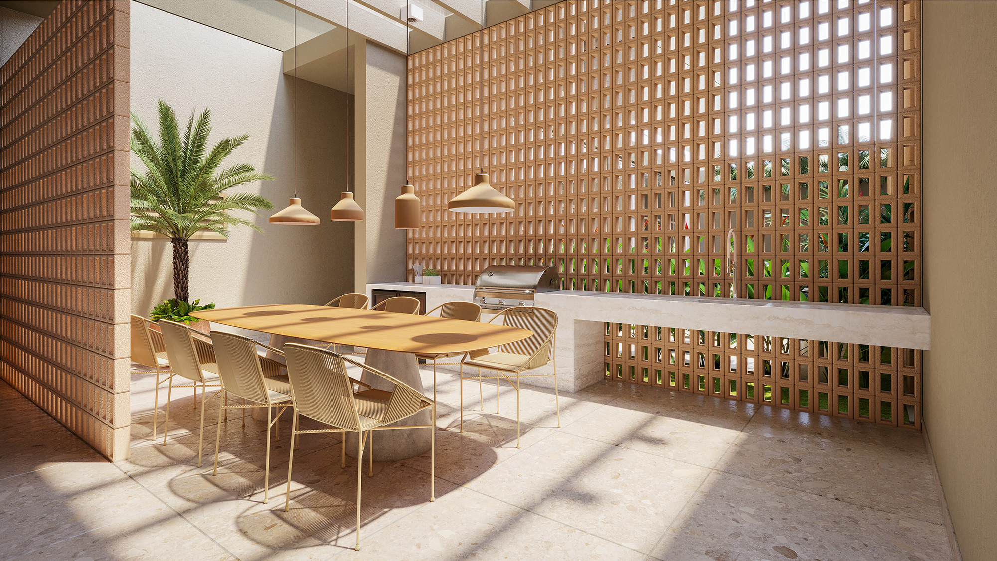 "O projeto de paisagismo buscou traços sensíveis para criar ambientes externos envolventes, significativos e vitais, com as múltiplas funções que os espaços abertos podem desempenhar no dia a dia dos moradores. A vegetação tem seu protagonismo tanto no térreo, envolvendo os ambientes que promovem o encontro entre pessoas, como nos terraços da torre. São paisagens urbanas que resgatam nossa conexão com a natureza e despertam novas experiências de cidade e seus ritmos."